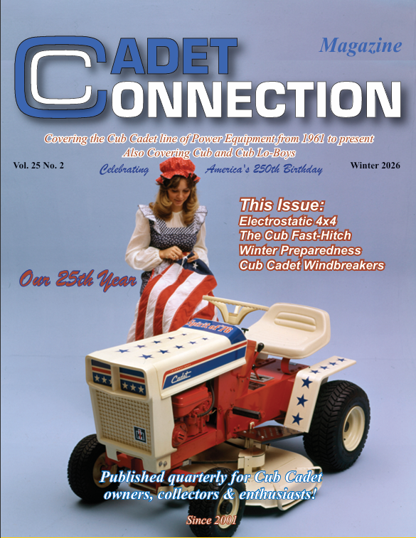 Welcome to our website featuring Cadet Connection, the magazine dedicated to covering the Cub Cadet line of Power Equipment from 1961 to the present, including Cub & Cub Lo-Boys! Cadet Connection is a quarterly, full-color publication covering all aspects of Cub Cadet tractors and equipment. We also welcome your stories, letters, and photos of Cub Cadets for potential inclusion in the magazine. Our Winter 2026 issue is pictured here and will be the current issue until March 31st.